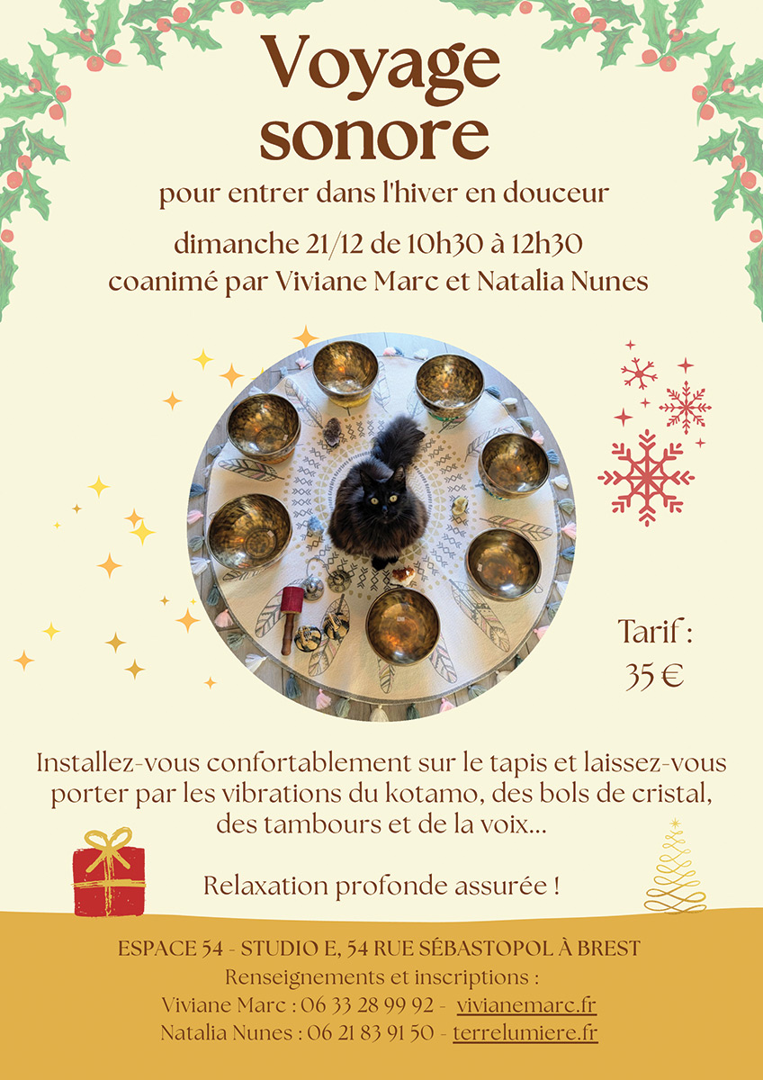 C'est avec joie que Natalia vous invite à partager un Voyage sonore coanimé avec Viviane Marc, le 21/12/2025 de 10h30 à 12h30 à L'Espace 54 Brest...